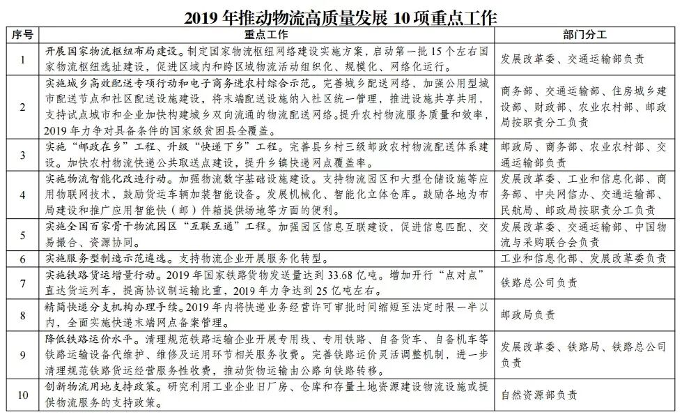 (五)促进现代物流业与制造业深度融合。加强生产服务型国家物流枢纽建设,利用枢纽聚集的大量物流资源,为制造企业提供高效快捷的物流服务,降低制造企业物流成本,提升区域制造企业竞争力,支撑制造业高质量集群化发展。以深化实施“互联网+”高效物流和物流降本增效专项行动为突破口,促进物流业与制造业深度融合创新发展。研究出台促进物流业与制造业深度融合发展的政策措施,鼓励物流企业为制造企业量身定做供应链管理库存、“线边物流”、供应链一体化服务等物流解决方案。实施服务型制造示范遴选,支持物流企业开展服务化转型。增加开行面向大型厂矿、制造业基地等的“点对点”直达货运列车,提高协议制运输比重,扩大大宗物资运量运能互保协议范围,2019年力争达到25亿吨左右。加快发展面向集成电路、生物制药、高端电子消费产品等高附加值制造业的航空货运服务,加大“卡车航班”开行力度,构建高价值商品的快捷物流服务网络。(发展改革委、交通运输部、工业和信息化部、民航局、铁路总公司负责)