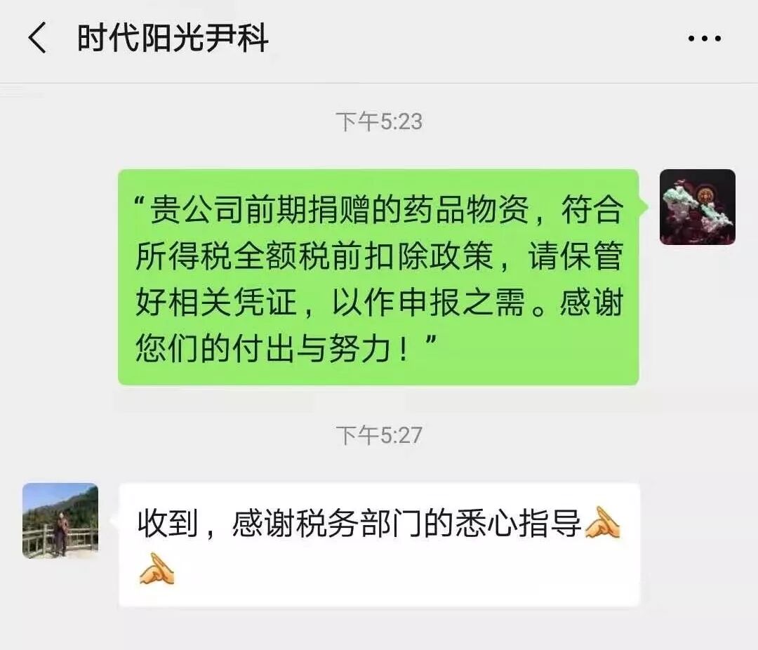 “贵公司前期捐赠的药品物资,符合所得税全额税前扣除政策,请保管好相关凭证,以作申报之需。感谢您的付出与努力!”2月11日,湖南时代阳光药业股份有限公司财务人员尹健收到了一条“温馨税务提醒”,这让他很是惊喜。